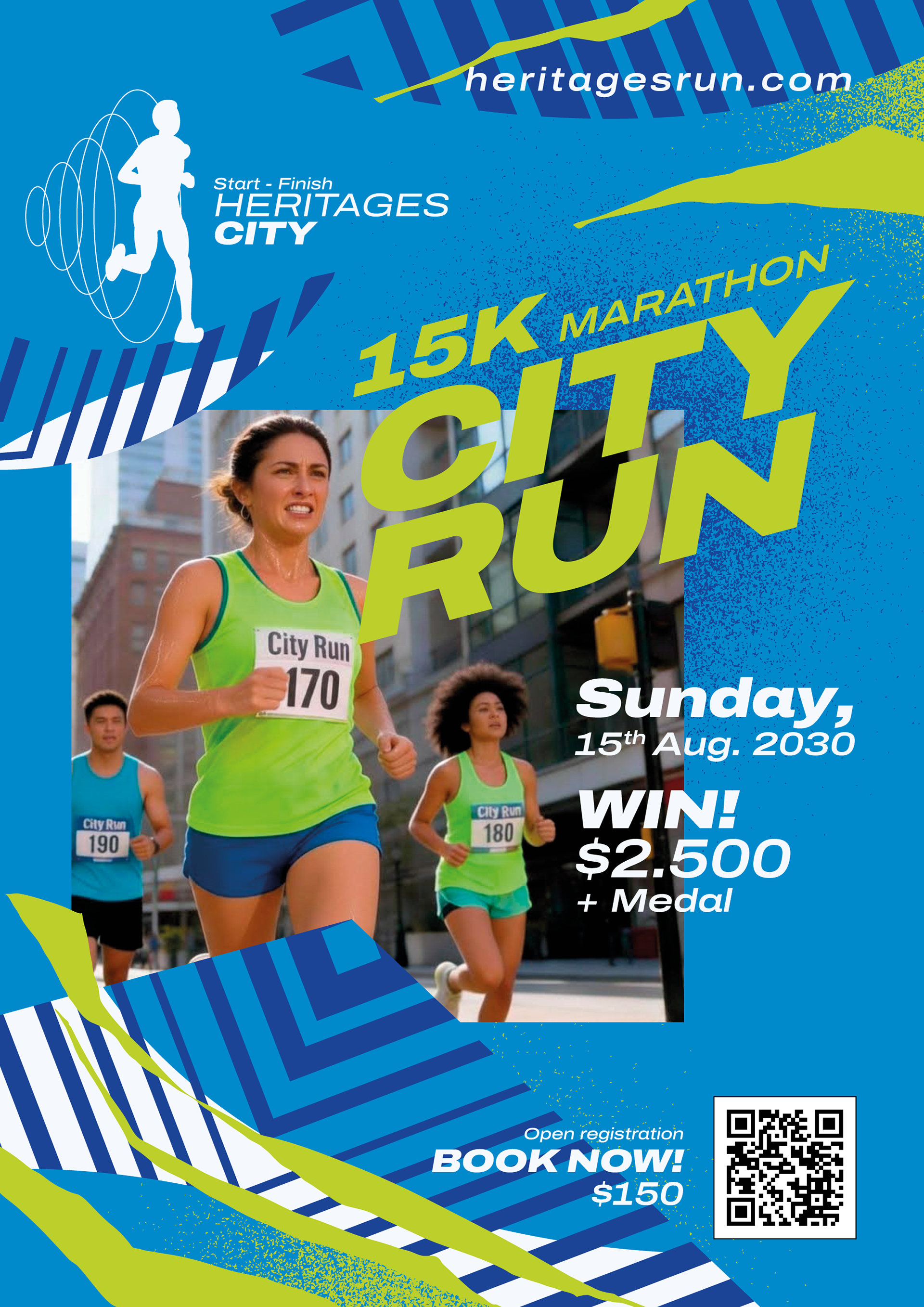 I developed a “Geometric Velocity” concept built around bold lines, clear structure, and fresh color contrasts. A Cyan Blue palette was chosen to represent trust, professionalism, and open air, supported by Lime Green accents to inject energy without appearing aggressive. Strong diagonal elements guide the viewer’s eye from the event logo through the title and runner imagery, ending at the registration QR code. The “CITY RUN” title uses an ultra-bold, italic sans-serif typeface that overlaps the runner photo, creating depth and the impression of forward motion. A modern runner silhouette with signal-wave styling reinforces a sense of technology and precision, aligning with chip-timing and tracking based events.