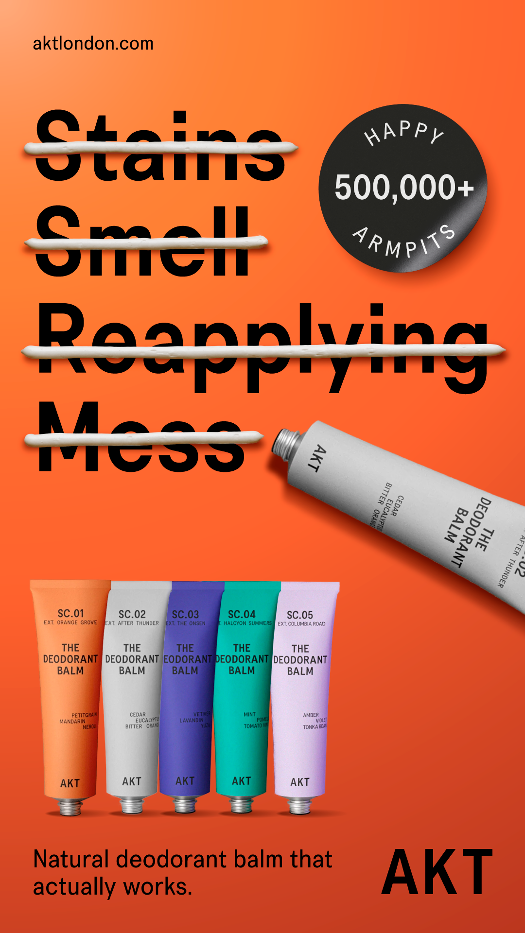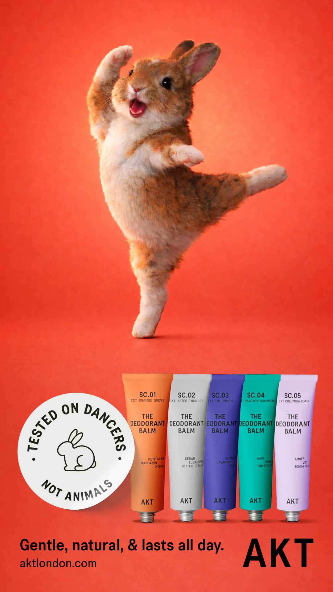 AKT London, a premium natural deodorant brand with roots in West End theatre, commissioned me to create performance-focused social media ads. The objective was customer acquisition, addressing two key motivations: ethical values (cruelty-free) and functional reliability (long-lasting protection).
