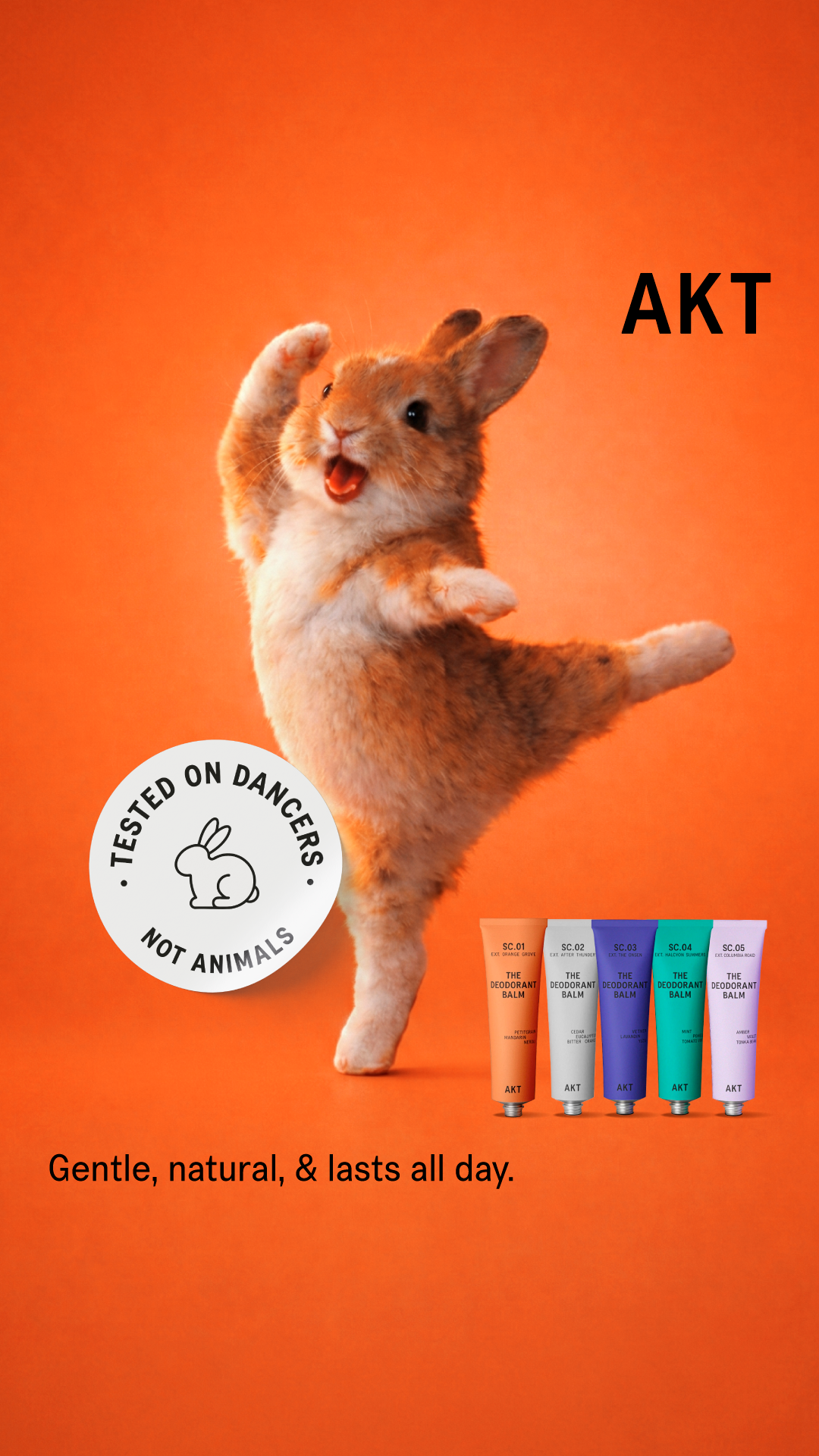 I developed two contrasting concepts to A/B test emotional storytelling against rational persuasion, anchored by AKT’s signature theatrical orange for instant brand recognition. One concept uses a playful visual metaphor of a ballet performing bunny to dramatize the “Tested on Dancers, Not Animals” message and communicate cruelty-free values with humor. The second concept takes a direct problem solution approach, visually eliminating common deodorant pain points using the product’s own texture, supported by strong social proof to reinforce credibility.