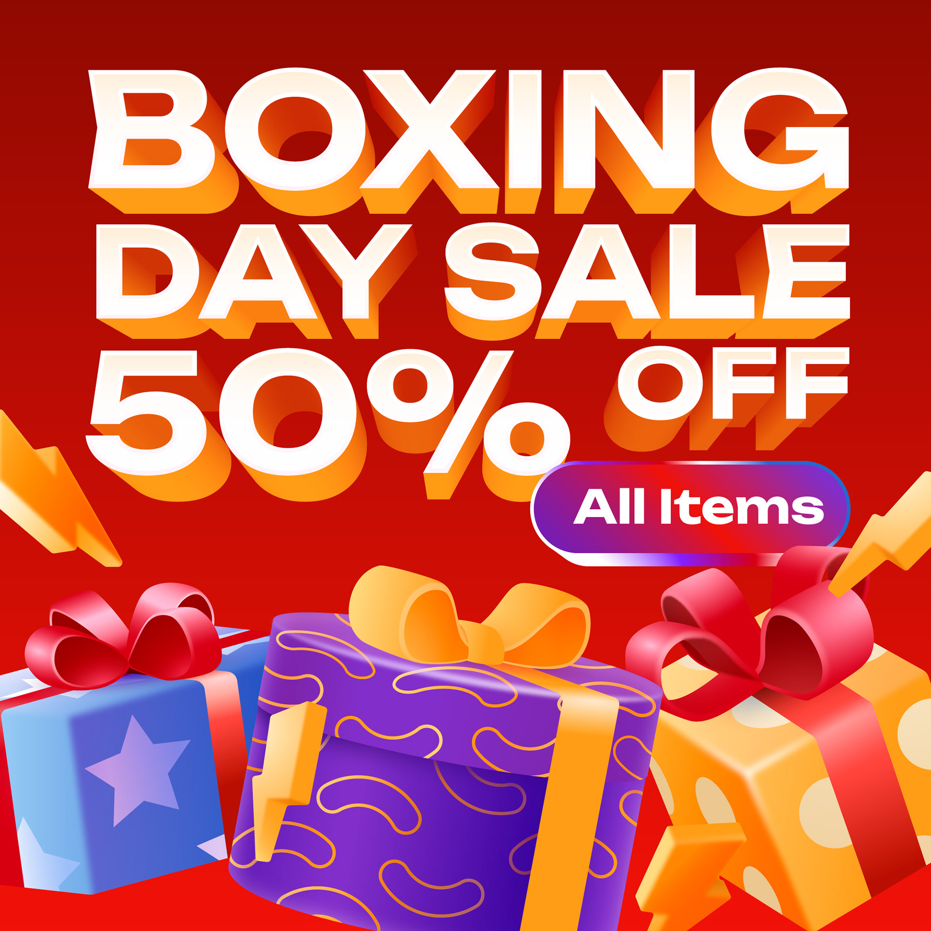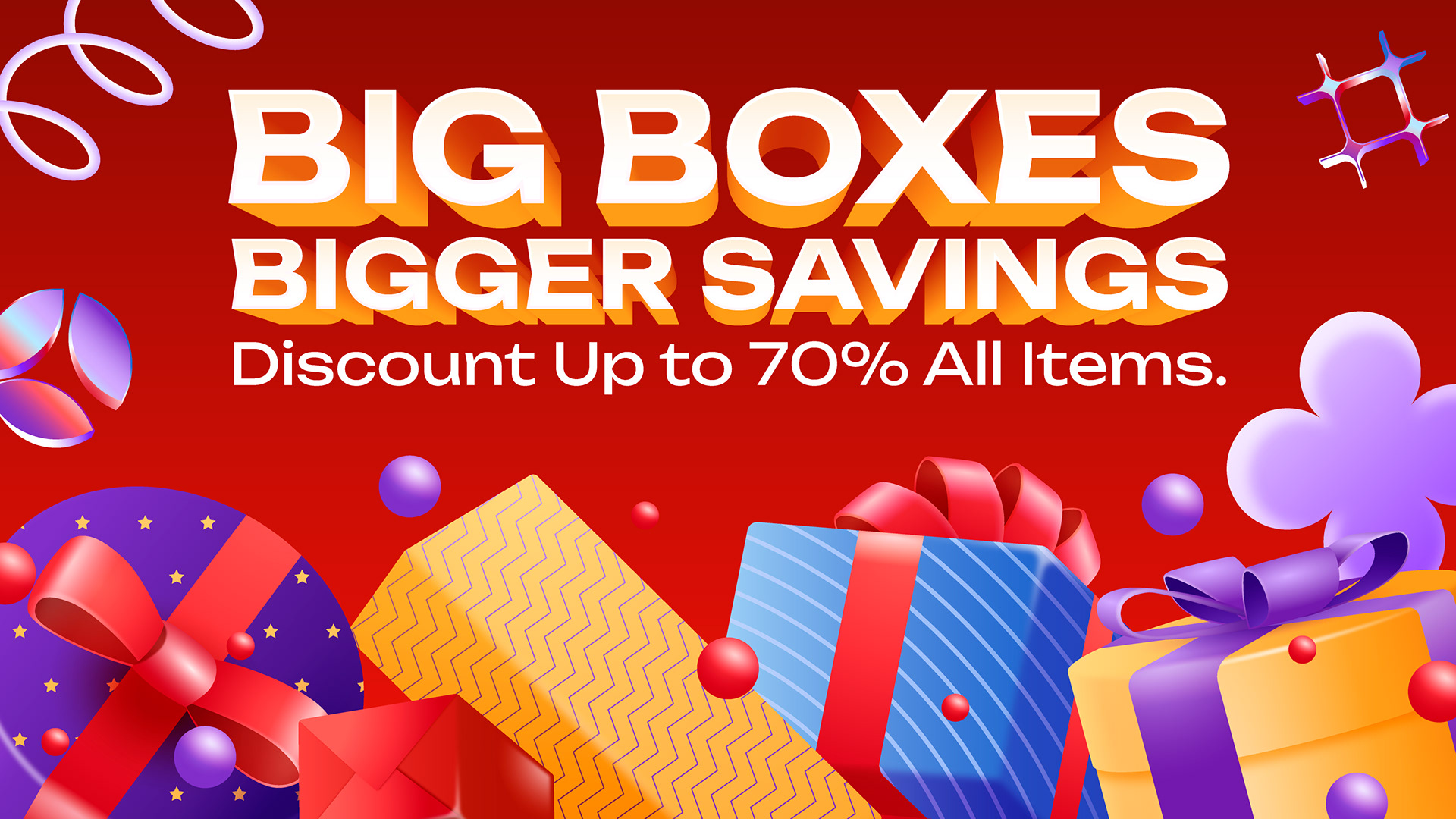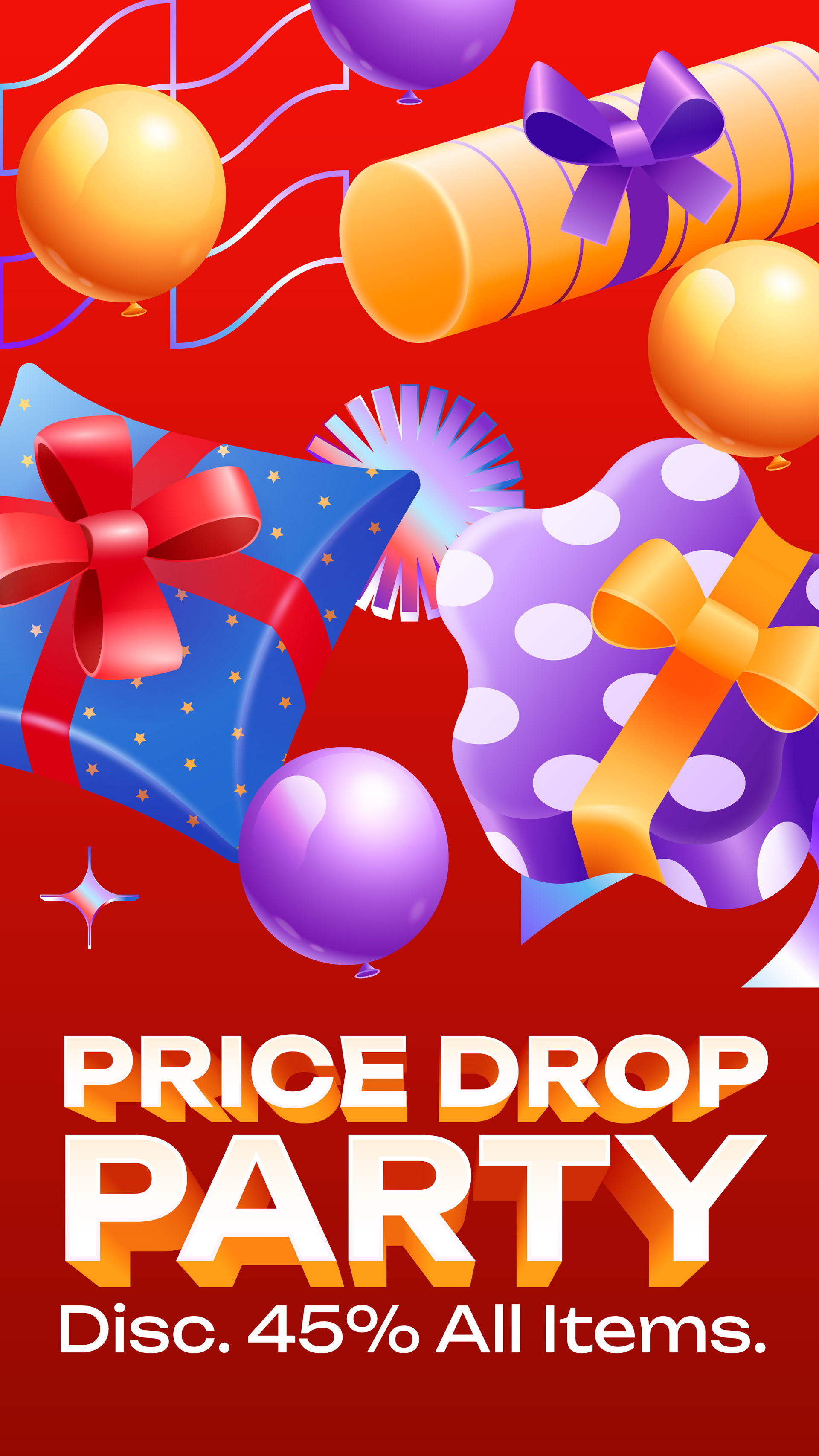 The design solution adopted a “Realistic Soft 3D” approach featuring chunky shapes, rounded edges, and soft lighting to create a friendly and modern impression. The color red, symbolizing a sale, was enriched with purple, orange, and light blue to build a cheerful party atmosphere. Gift and balloon elements were designed to resemble toys, while bold sans-serif typography with 3D extrusion effects helped the promotional titles visually blend with the objects rather than sitting as a mere text overlay.