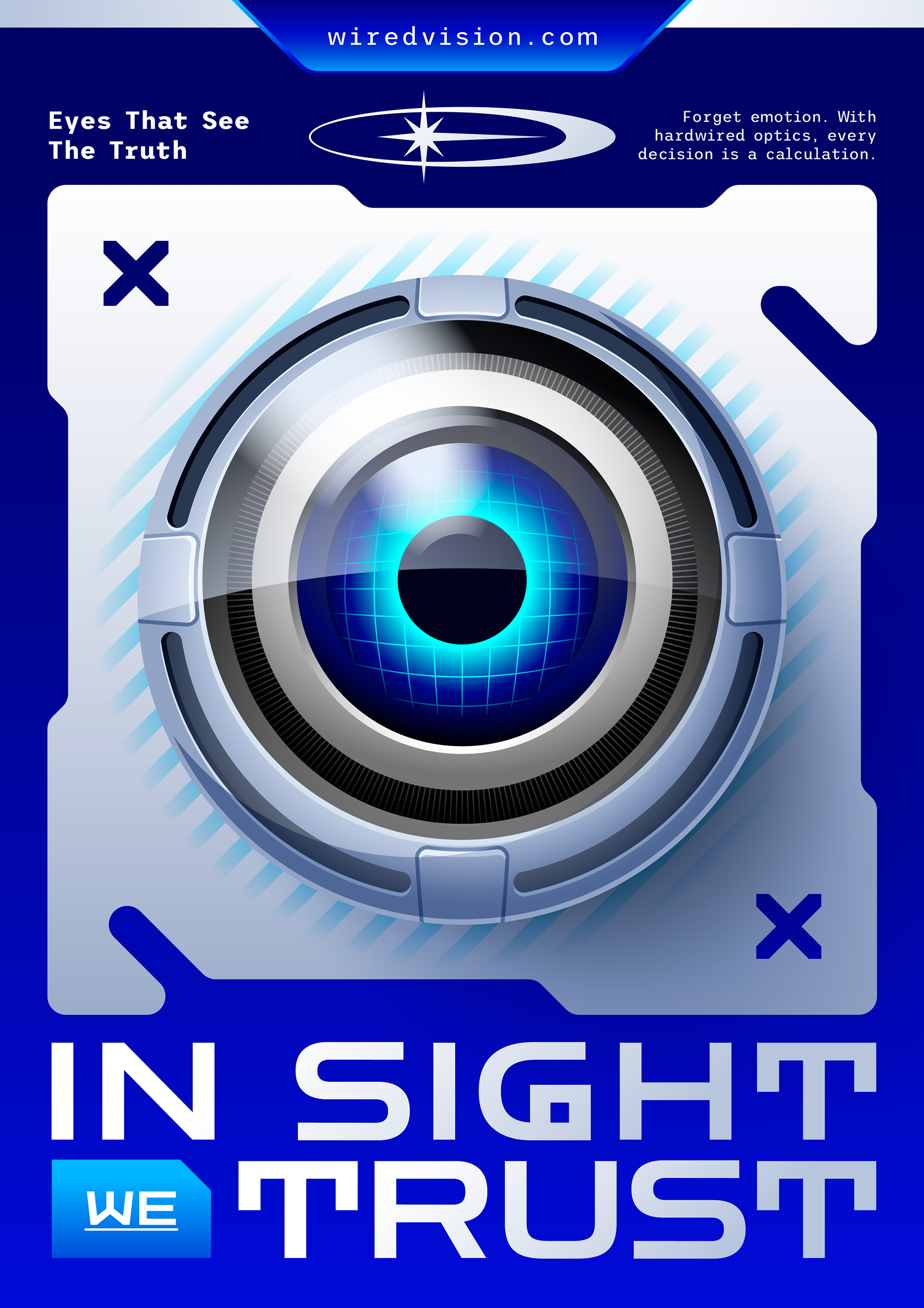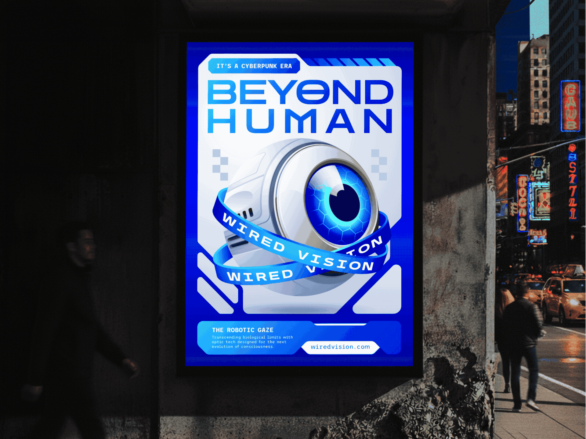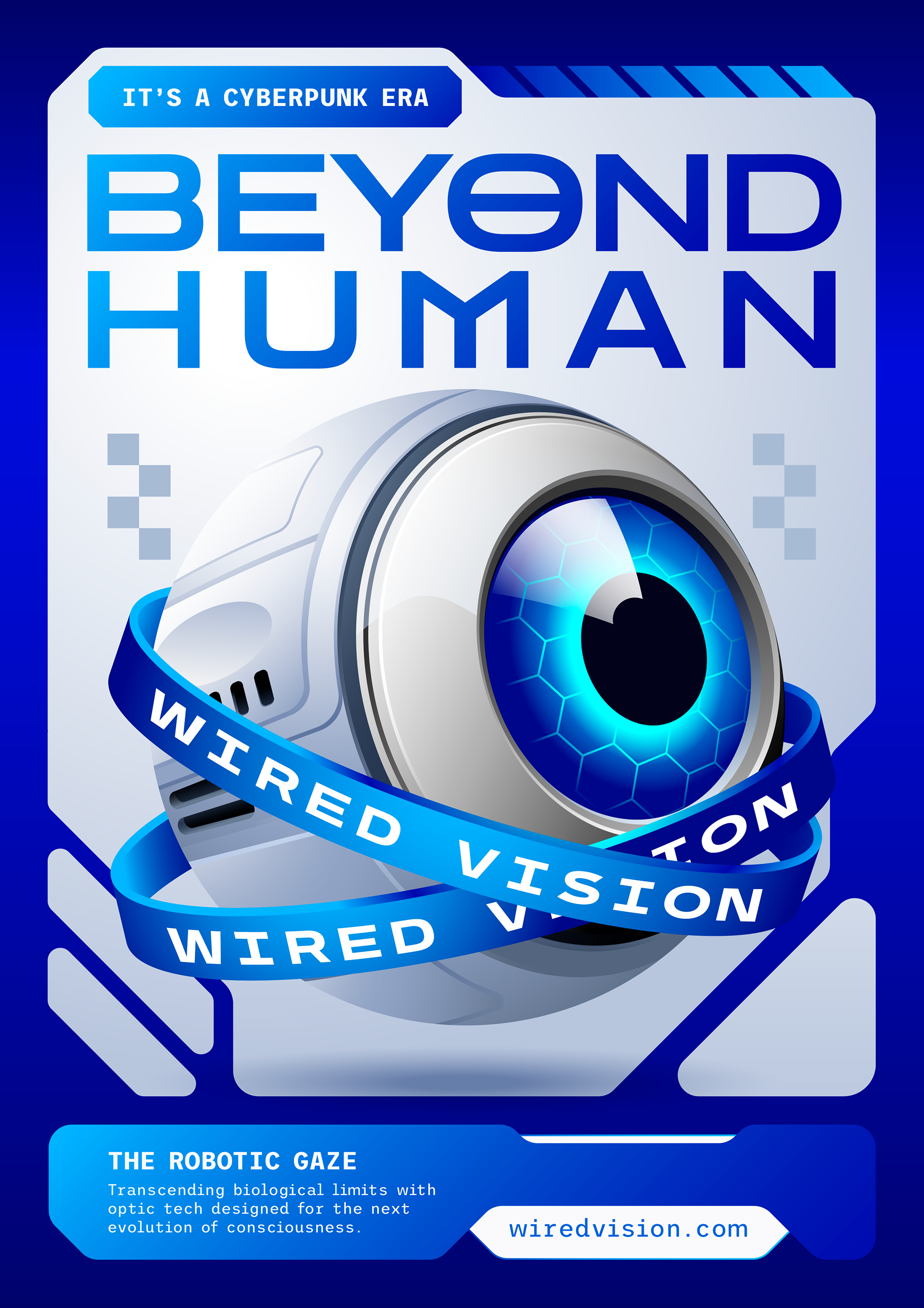 The project required a careful balance between realism and graphic impact. The robotic eye needed convincing metallic textures and luminous glow effects while remaining bold and readable at different sizes. Integrating futuristic typography without overpowering the detailed illustration was another key concern. In addition, the series had to feel like a cohesive campaign under a fictional future-facing brand, Wired Vision, rather than a set of unrelated visuals.