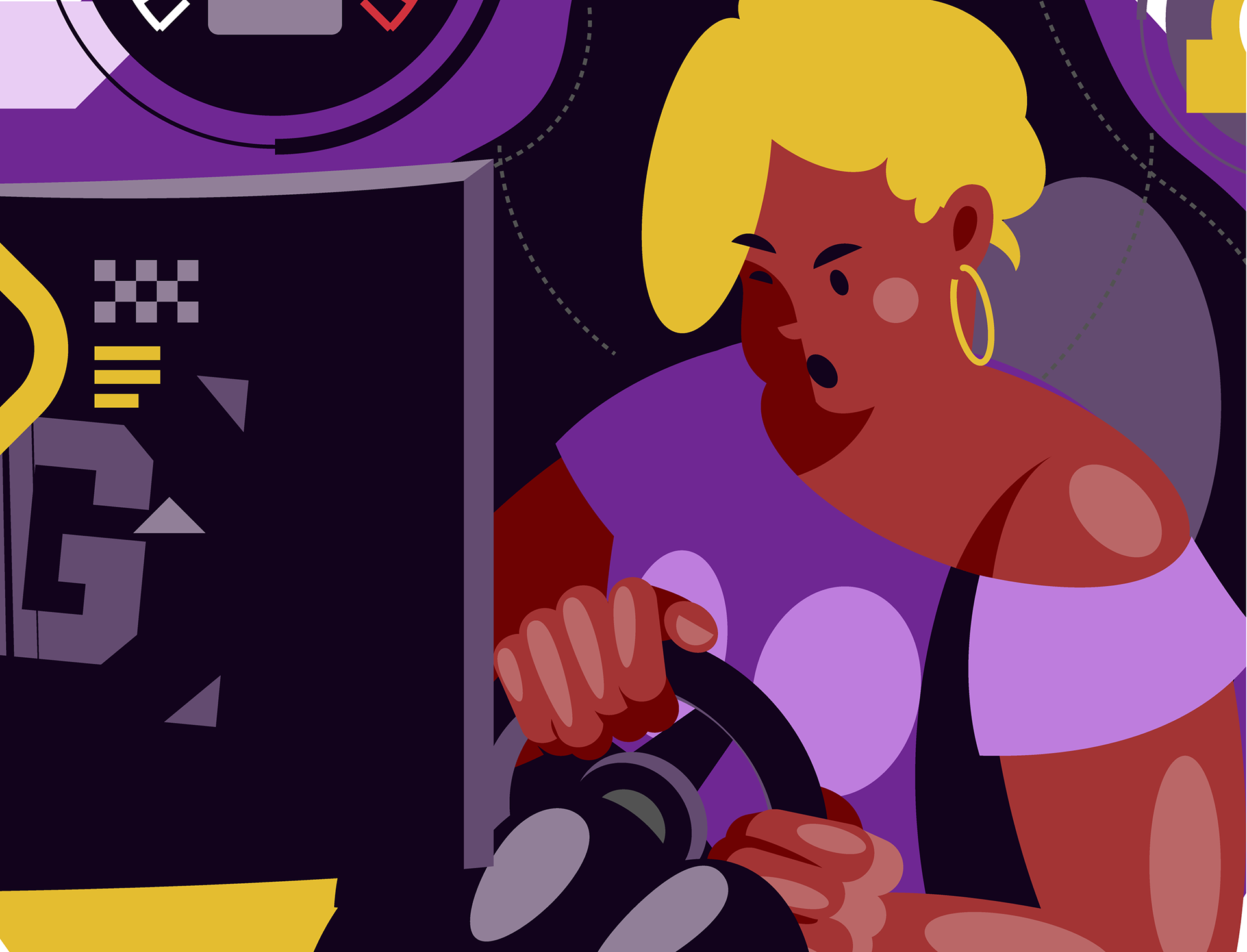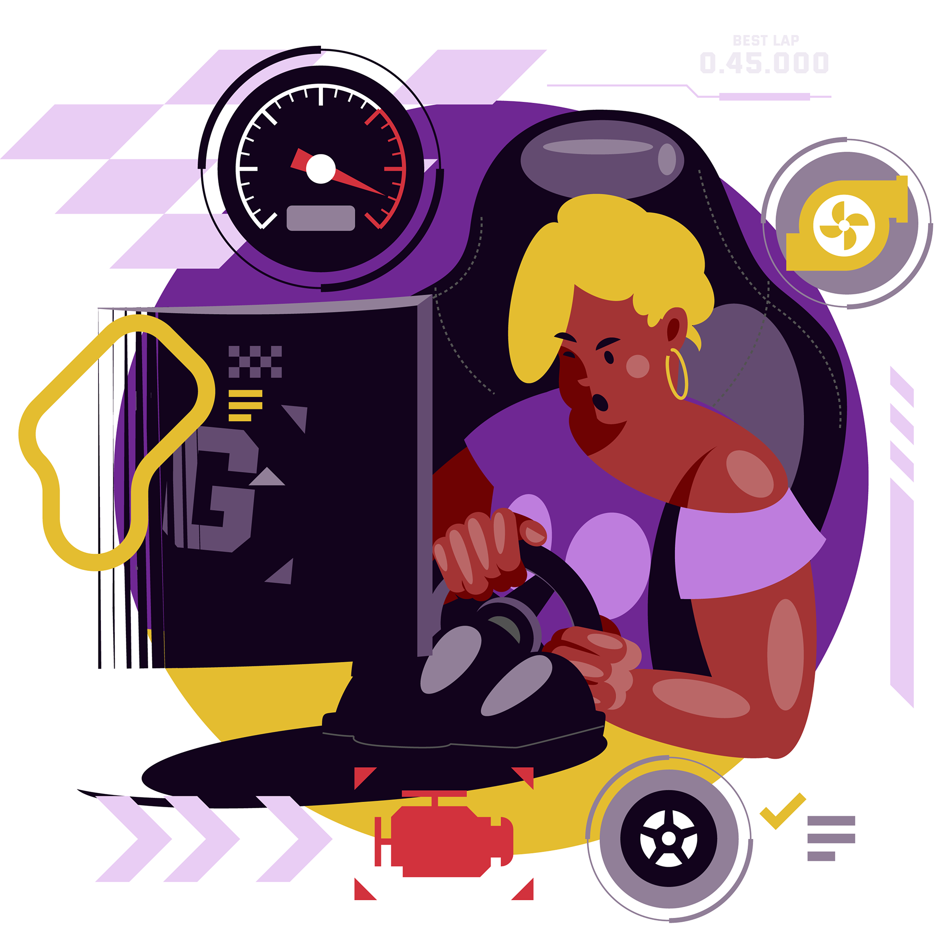 This illustration focuses on the excitement of racing games and the immersive experience they offer to players. The scene highlights a moment of full concentration as the character grips the wheel, responding to the intensity of the virtual track.