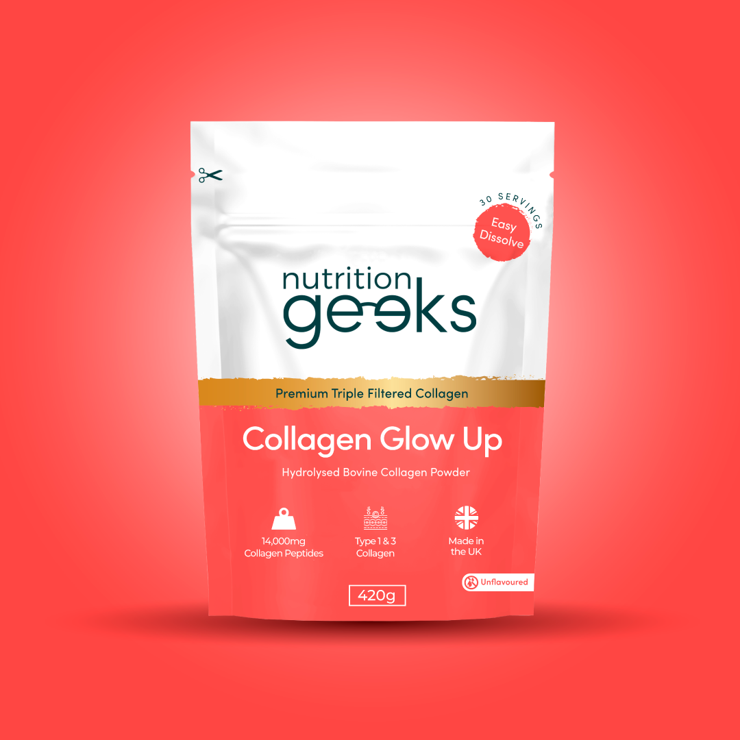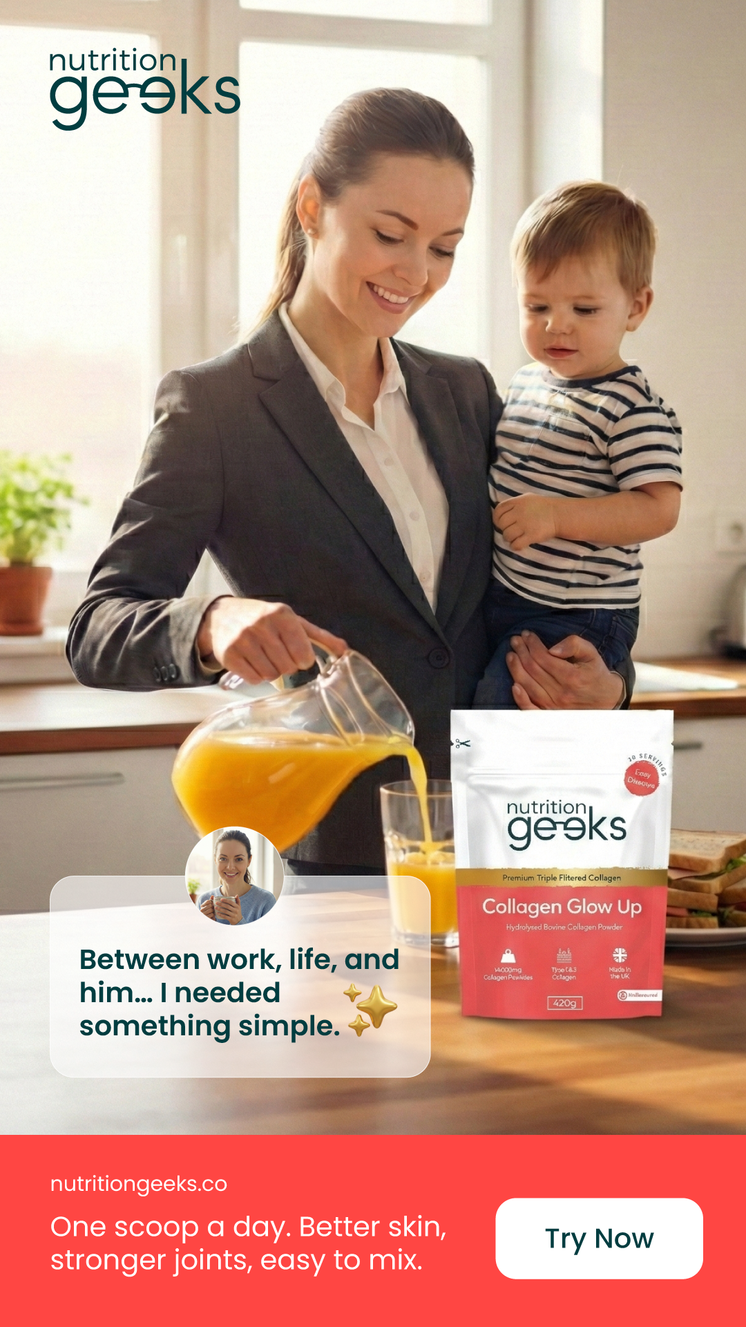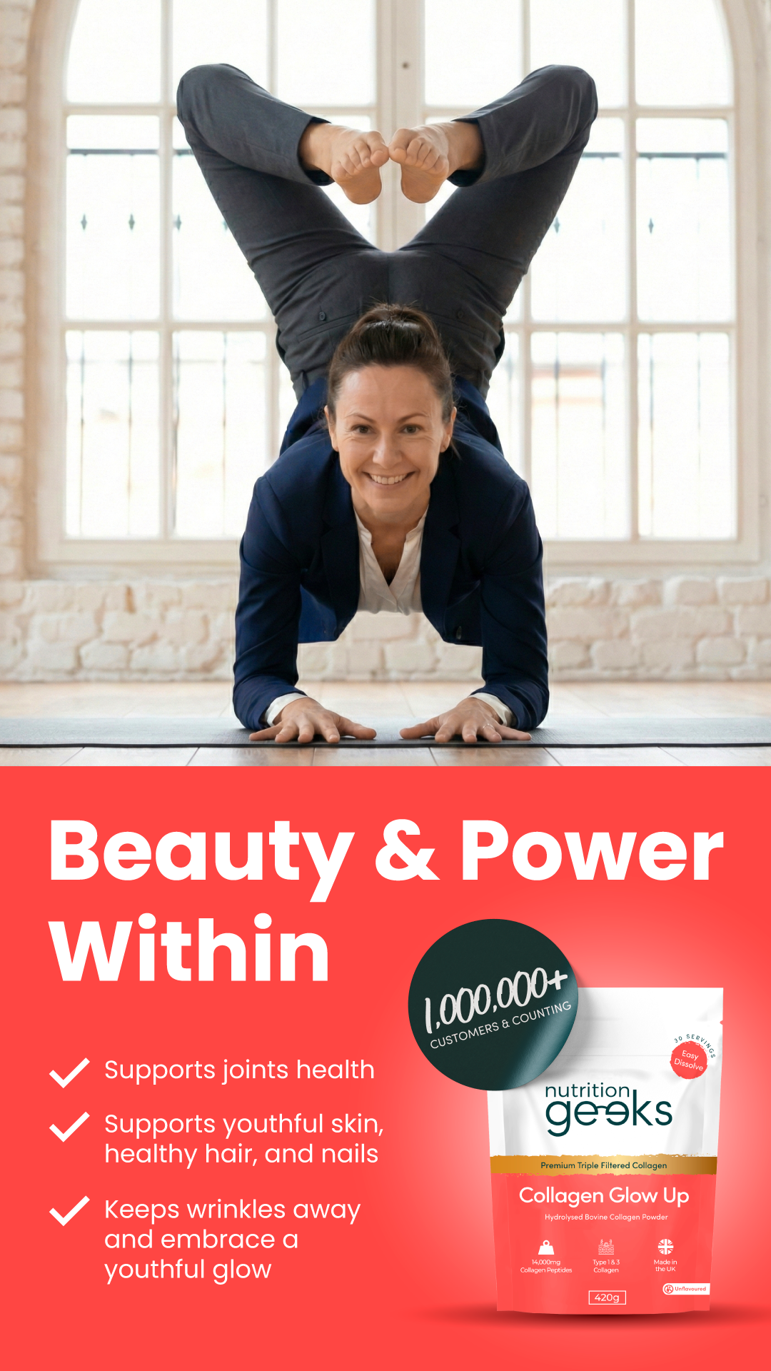 Nutrition Geeks commissioned me to design a set of static performance ads for their Collagen Glow Up powder. The campaign targeted the “modern busy woman,” balancing career, family, and personal health. Two distinct visual directions were created, one focused on vitality and empowerment, and the other on convenience and lifestyle.