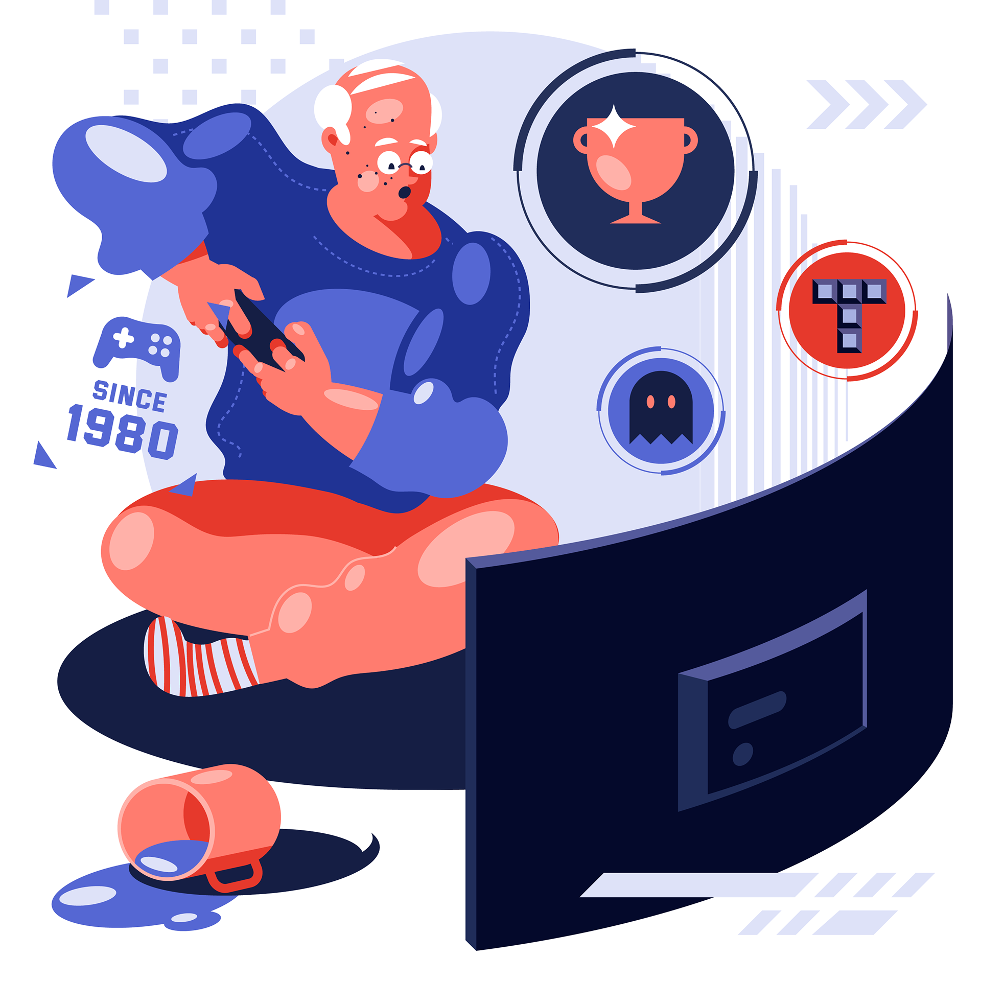 These illustrations explore the everyday joy of gaming through two distinct characters, each immersed in their own playful world. The concept highlights how video games connect people across ages, habits, and personalities.