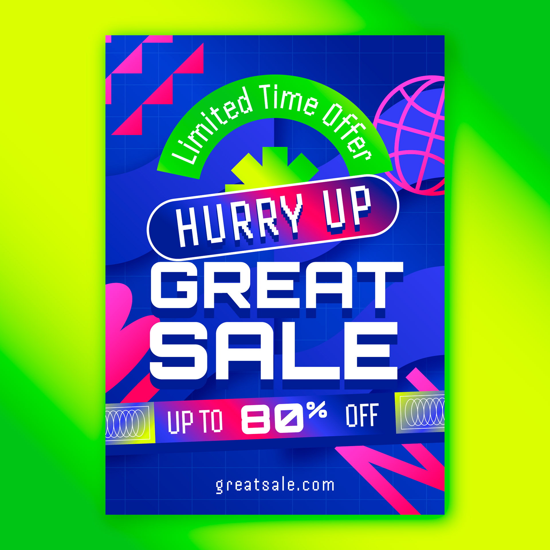 The design adopts a Neo-Retro and glitch-inspired aesthetic to deliver instant visual impact. A dark blue grid background combined with wireframe globe elements references 90s and Y2K internet culture, tapping into current nostalgia trends. Typography is built around contrast and hierarchy, pairing a large 3D-extruded headline with pixel-style supporting text to reinforce the digital tone. Electric gradients with acid green, neon pink, and deep violet replace standard sale colors, amplifying contrast and pulling focus directly to the “80% OFF” message.