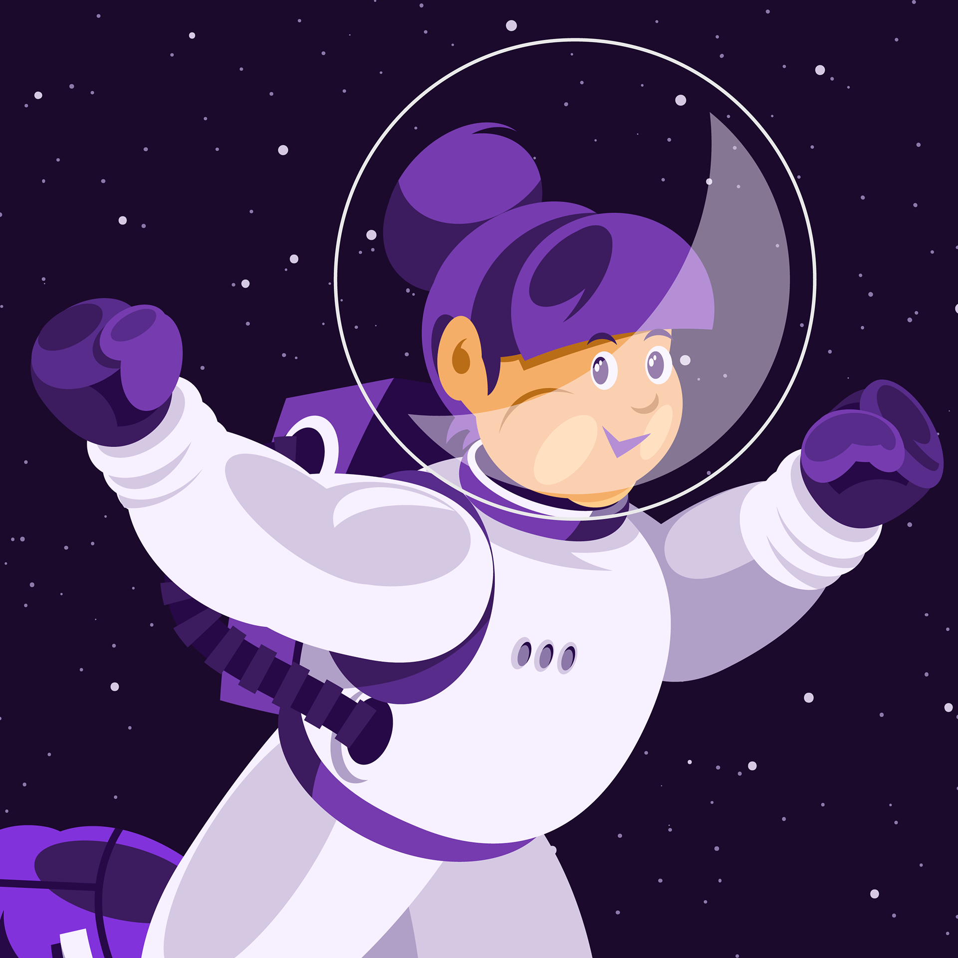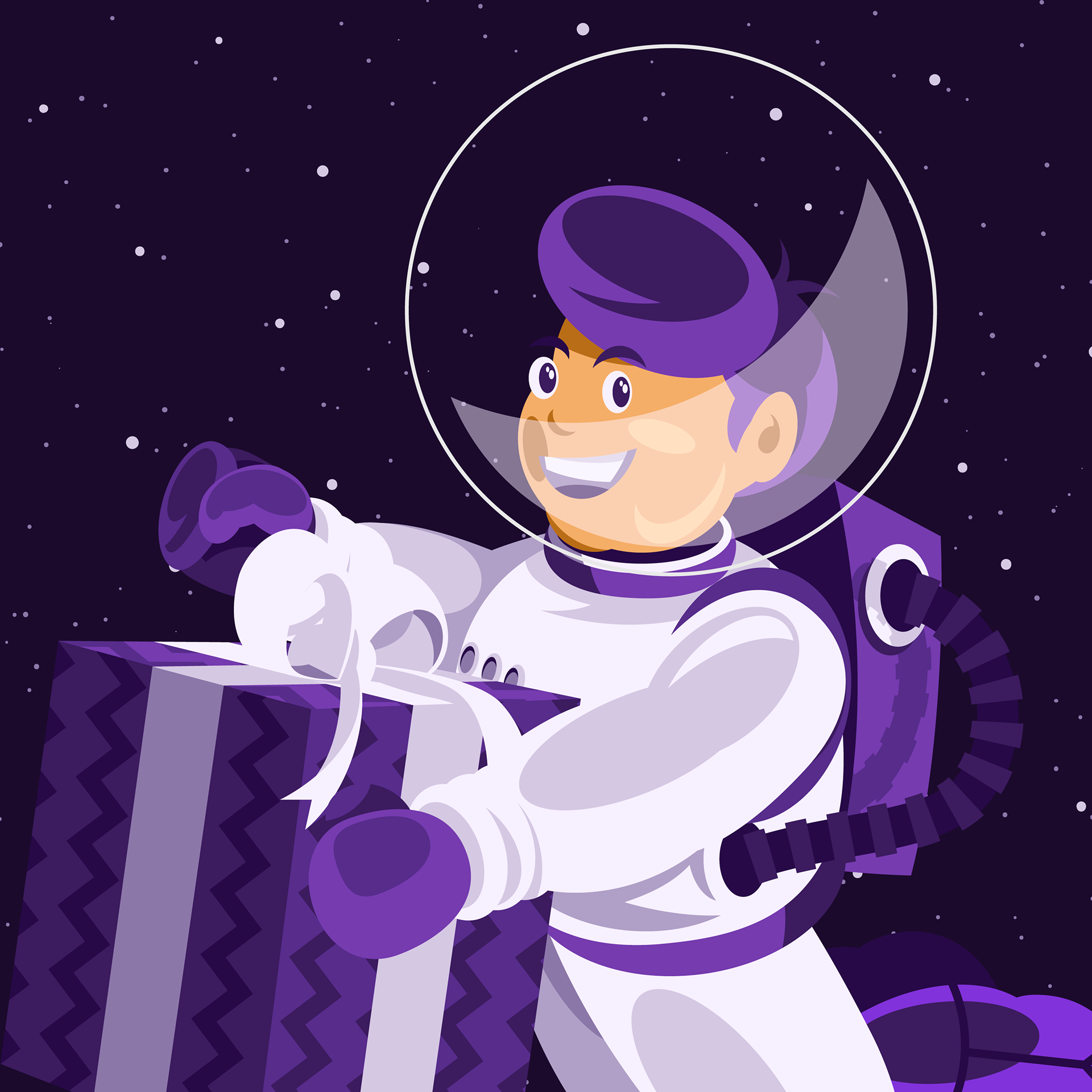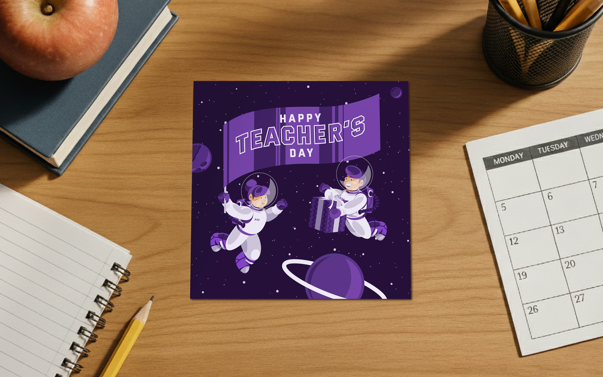 The objective focused on crafting a fun, memorable scene that symbolizes how teachers help students explore new worlds. Vibrant purples, expressive character poses, and floating elements create a sense of zero-gravity joy. By blending space-themed storytelling with a bold banner and gift exchange, the illustration clearly delivers its message of gratitude while staying energetic and visually engaging.
