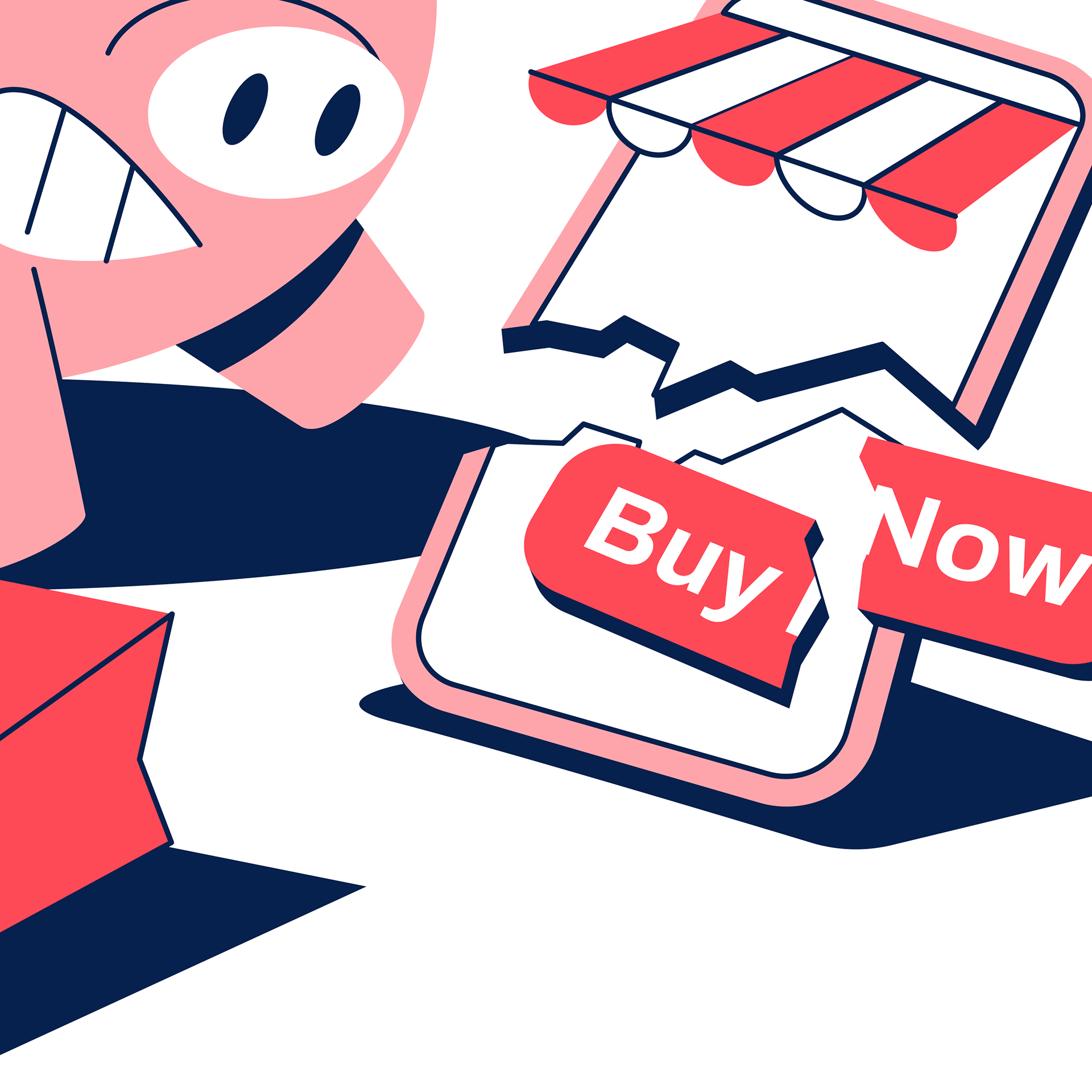 The objective focused on simplifying financial pressure into a humorous metaphor. Bold shapes, limited colors, and expressive character poses help amplify the energy of the message. Broken “Buy Now” buttons, scattered shopping elements, and the piggy bank’s fierce expression reinforce the narrative that savings can triumph over impulse. Through these choices, the illustration delivers a clear and entertaining reminder to stay mindful of spending.